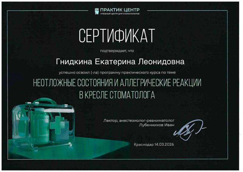 ГБПОУ «Краснодарский краевой базовый медицинский колледж», г. Краснодар, сертификат, специальность: стоматология.